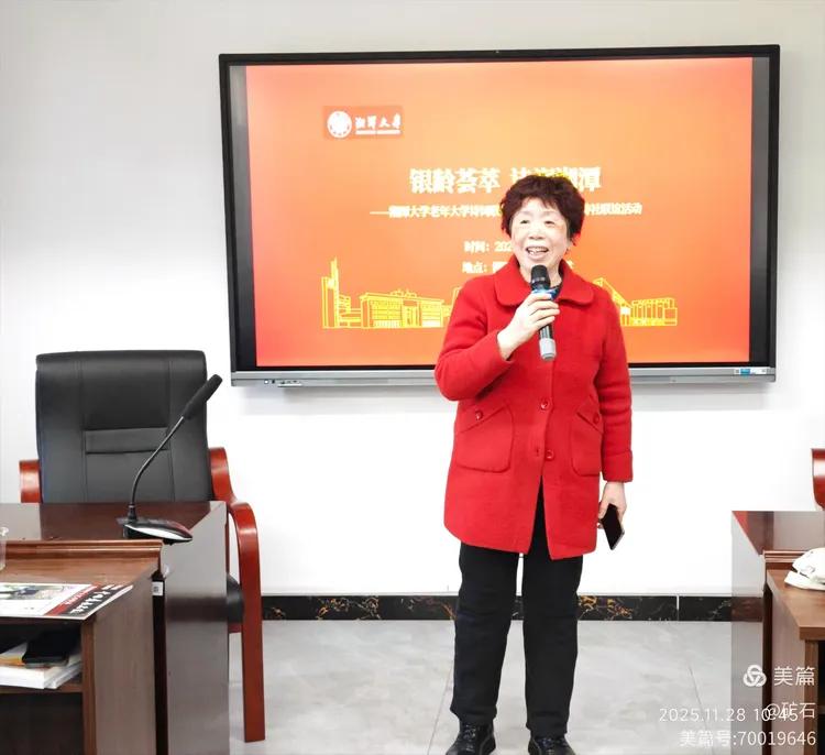 湘潭市老年大学常青诗社社长王红专讲话,他介绍了诗社的发展概况、特色活动及创作亮点,希望双方能以活动为契机,推动校地老年教育交流,促进诗词联的创作步入新境界。